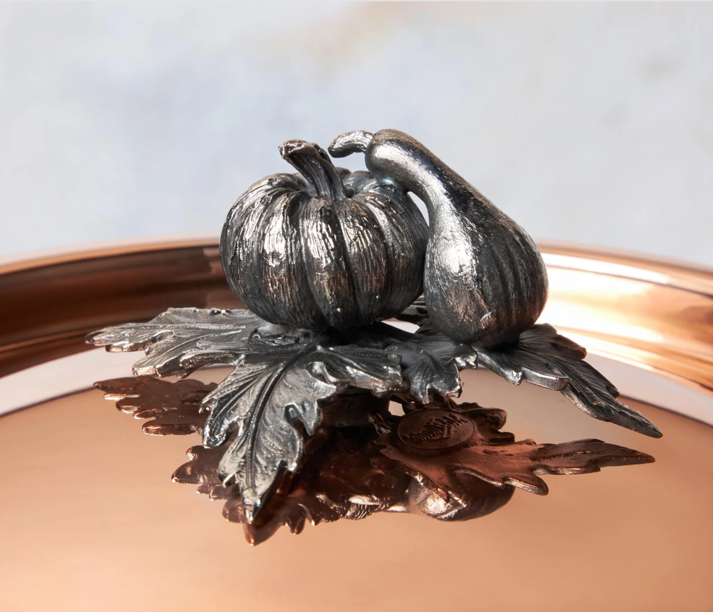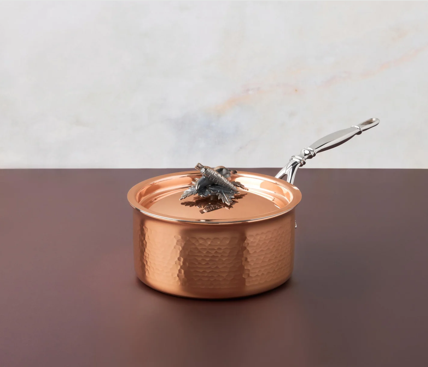 Each piece is crafted from solid copper for unmatched heat responsiveness, then hammered by our master artisans for greater durability and enduring beauty. The interiors are lined with easy-to-maintain stainless steel, while the stainless steel handles feature delicate leaf detailing. The copper-clad lids are crowned with silver-plated bronze finials shaped like charming garden vegetables each one hand cast for exceptional artistry.